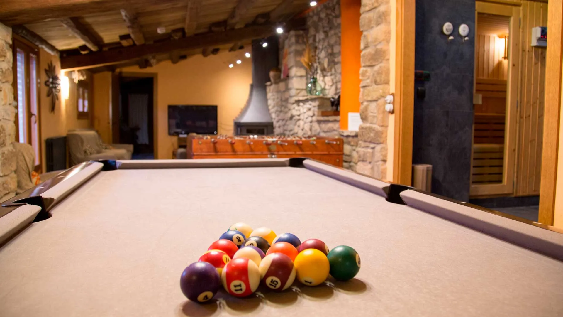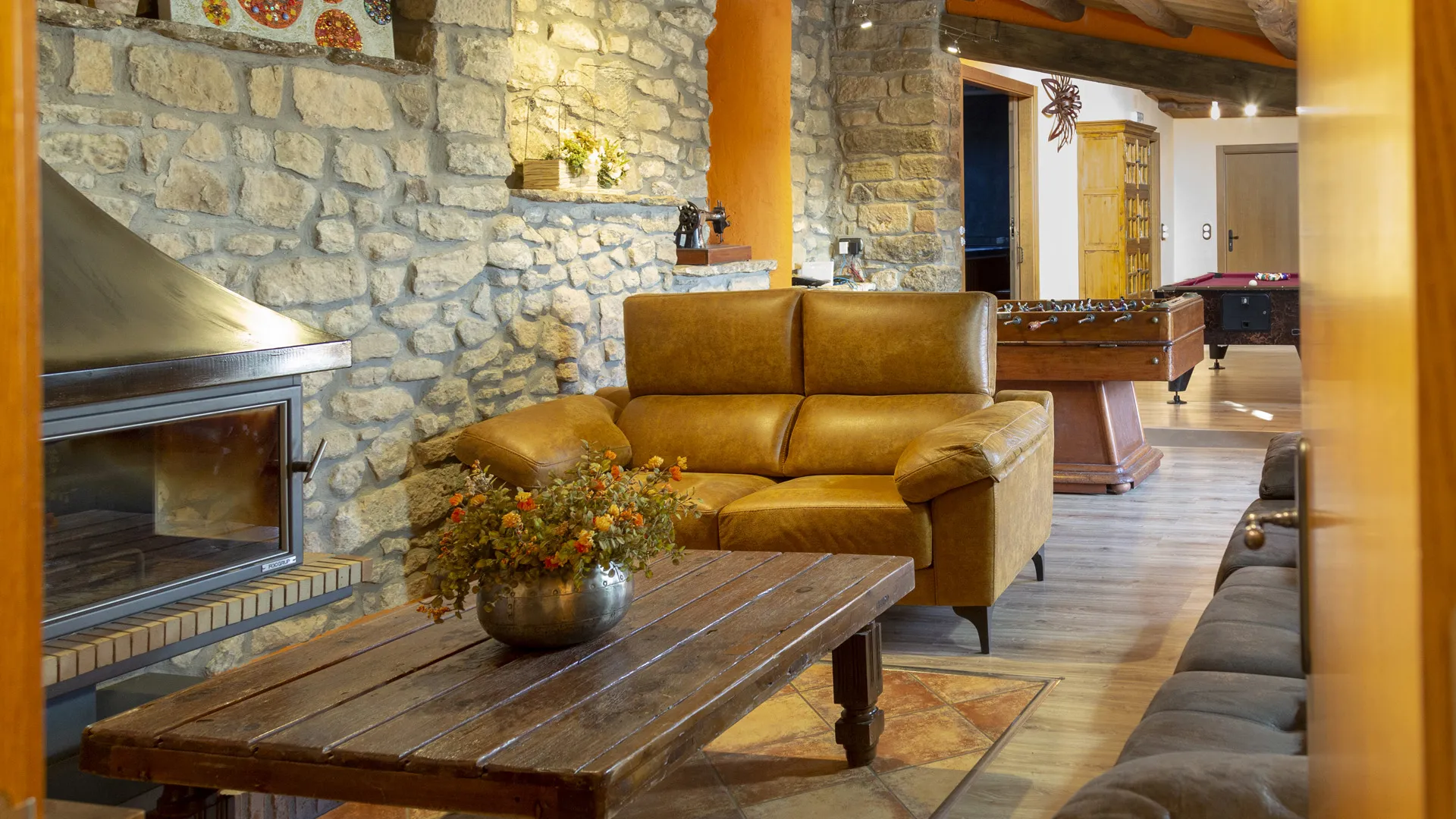 Els espais interiors de Cal Domingo sorprenen per la seva amplitud i confort. La zona spa disposa de jacuzzi amb aigua tractada individualment per a cada grup. La piscina climatitzada, tractada amb hidròlisi i clorador salí, permet gaudir de l’aigua en qualsevol època de l’any. Per als moments de lleure, les zones comuns ofereixen biblioteca, sala de jocs, futbolí, billar, diana, llar de foc, Wii, jocs de taula, DVD i Wi-Fi. La casa disposa també de zona chill out i una sala de reunions, ideal per a grups o equips professionals.